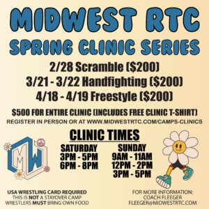 Join us for all 3 of our spring clinics and get a free shirt and save some money! This camps are each 5 sessions. Must have a USA Wrestling Card. Please pack food and clothes. No longer offering overnight option.